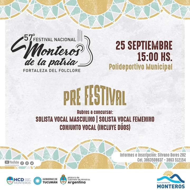 ¡Atención artistas! Se habilitó el espacio de inscripción para participar del Pre Festival Monteros de la Patria Fortaleza del Folclore, que otorga la posibilidad de formar parte de la edición 57° de la gran fiesta del folclore en la ciudad.