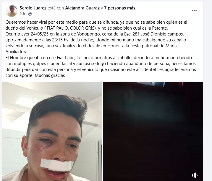 Como consecuencia del impacto, el joven sufrió múltiples lesiones de tipo craneo facial y fue asistido por familiares y vecinos de la zona. La denuncia fue radicada por sus allegados, quienes también hicieron un pedido público de colaboración para identificar al conductor y al vehículo involucrado, ya que huyó sin brindar ayuda ni dar aviso a las autoridades, configurando un claro abandono de persona.