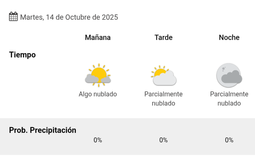 Para esta jornada la temperatura mínima es de 14° y la máxima se ubicará en los 33°, al mediodía. En cuanto a la humedad se mantiene en 42%. El viento corre del oeste a 6 km/h y la visibilidad en caminos es de 6 km.