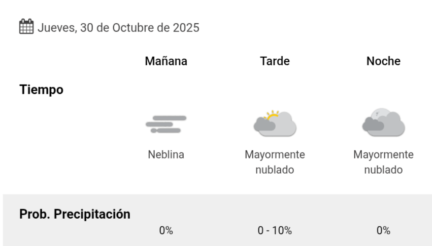 Para esta jornada la temperatura mínima es de 11° y la máxima se ubicará en los 21°, al mediodía. En cuanto a la humedad se mantiene en 95%. El viento permanecerá en calma y la visibilidad en caminos es de 6 km.