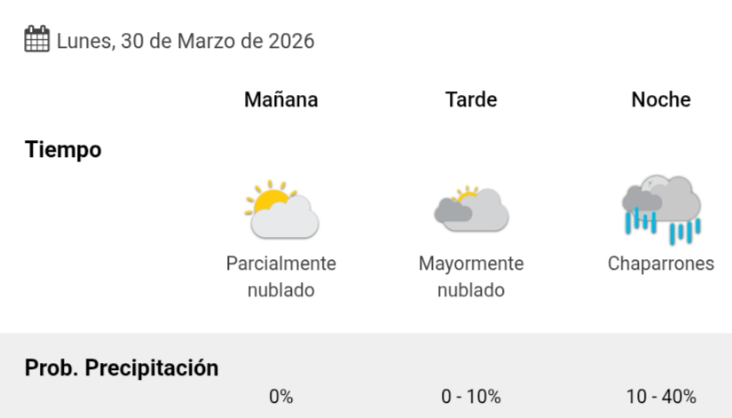 En cuanto a las marcas térmicas para hoy, son las siguientes: 23° de mínima y 34° de máxima que podría llegar al mediodía. La humedad es del 91%. El viento corre del noroeste a 8 km/h y la visibilidad es de 12 km.