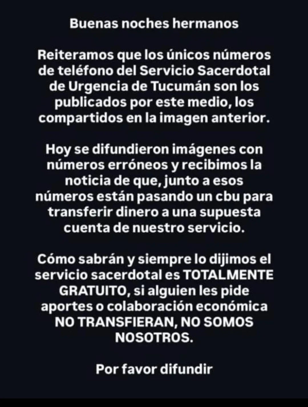 En los últimos días circularon en redes sociales mensajes que difundían números de teléfono falsos vinculados al Servicio Sacerdotal de Urgencia de Tucumán, acompañados incluso por pedidos de transferencias bancarias a cuentas que no pertenecen al servicio.
