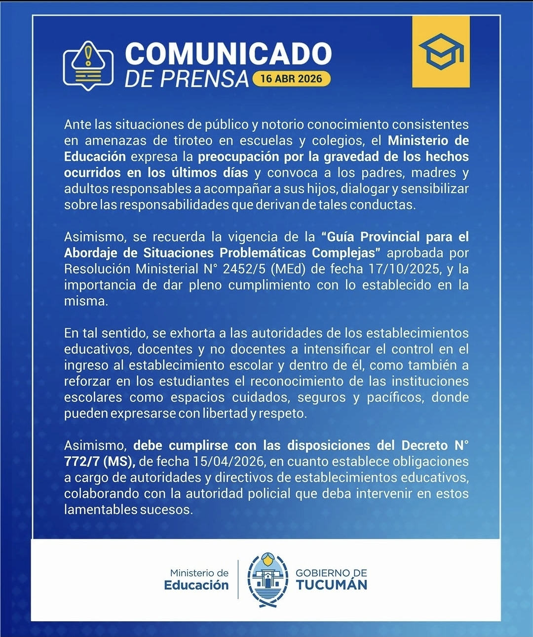 El Ministerio de Educación de Tucumán emitió un comunicado dirigido a las autoridades, docentes y personal no docente de establecimientos educativos de gestión estatal y privada, en el marco de las recientes amenazas de tiroteo en instituciones escolares que son de público conocimiento.